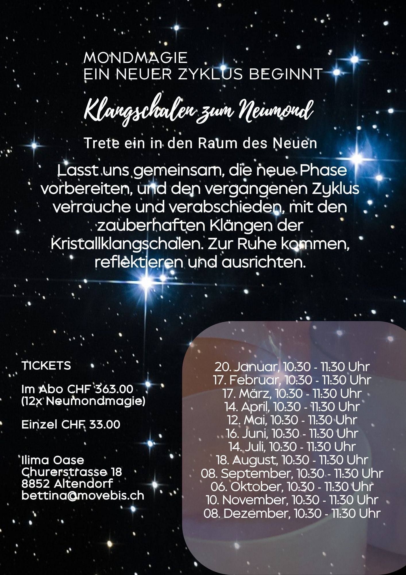 Eine neue Phase steht vor der Tür. Lasst uns gemeinsam diese Phase vorbereiten, mit den zauberhaften Klängen der Kristall-Klangschalen. Wir nehmen uns Zeit, um gemeinsam den letzten Zyklus zu verarbeiten, zu reflektieren und zur Ruhe zu kommen.